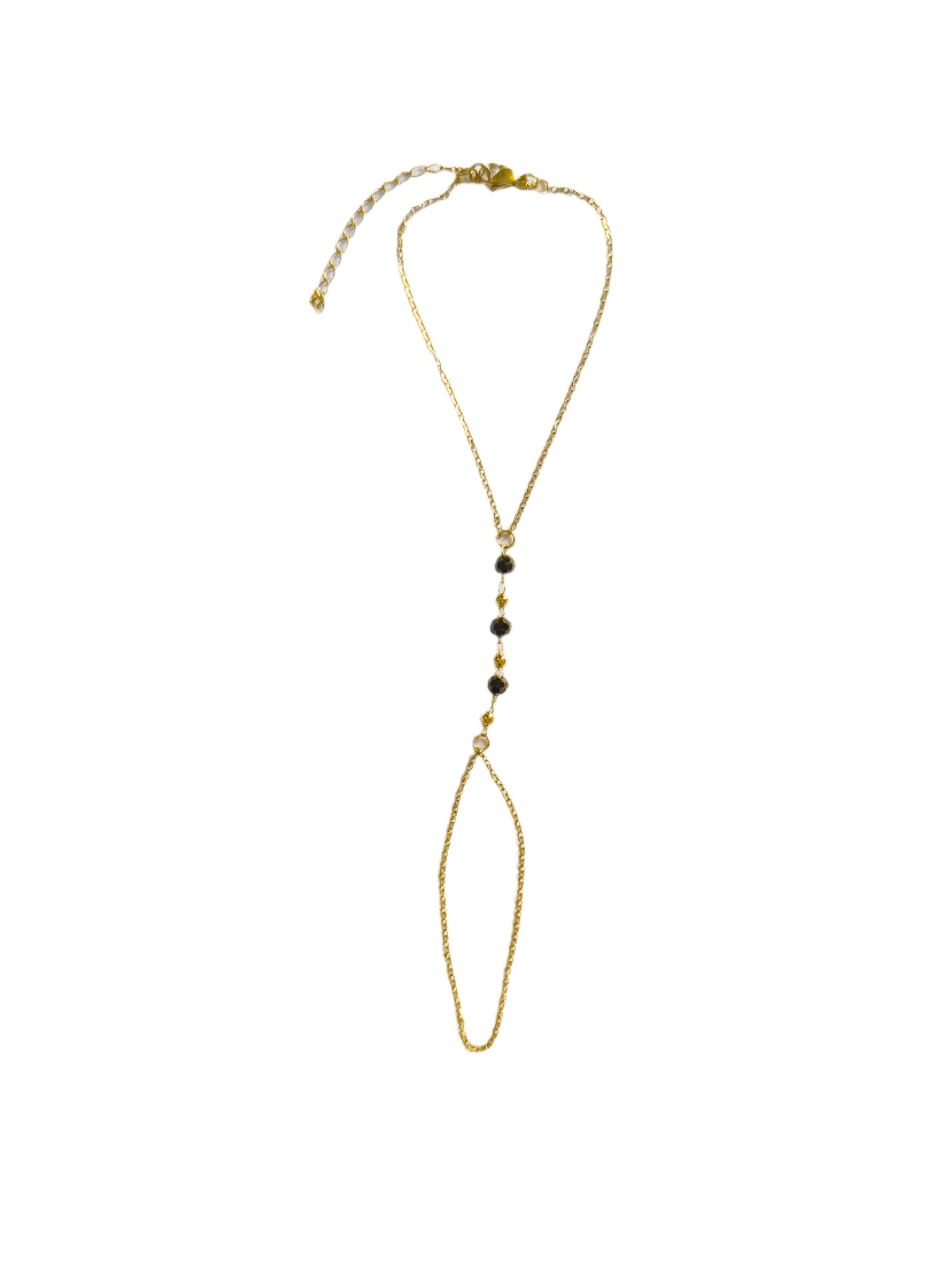 This stylish handchain features a stainless steel bracelet ring with an adjustable fit. The black and gold beads add a touch of elegance. Expertly crafted and perfect for any occasion.
