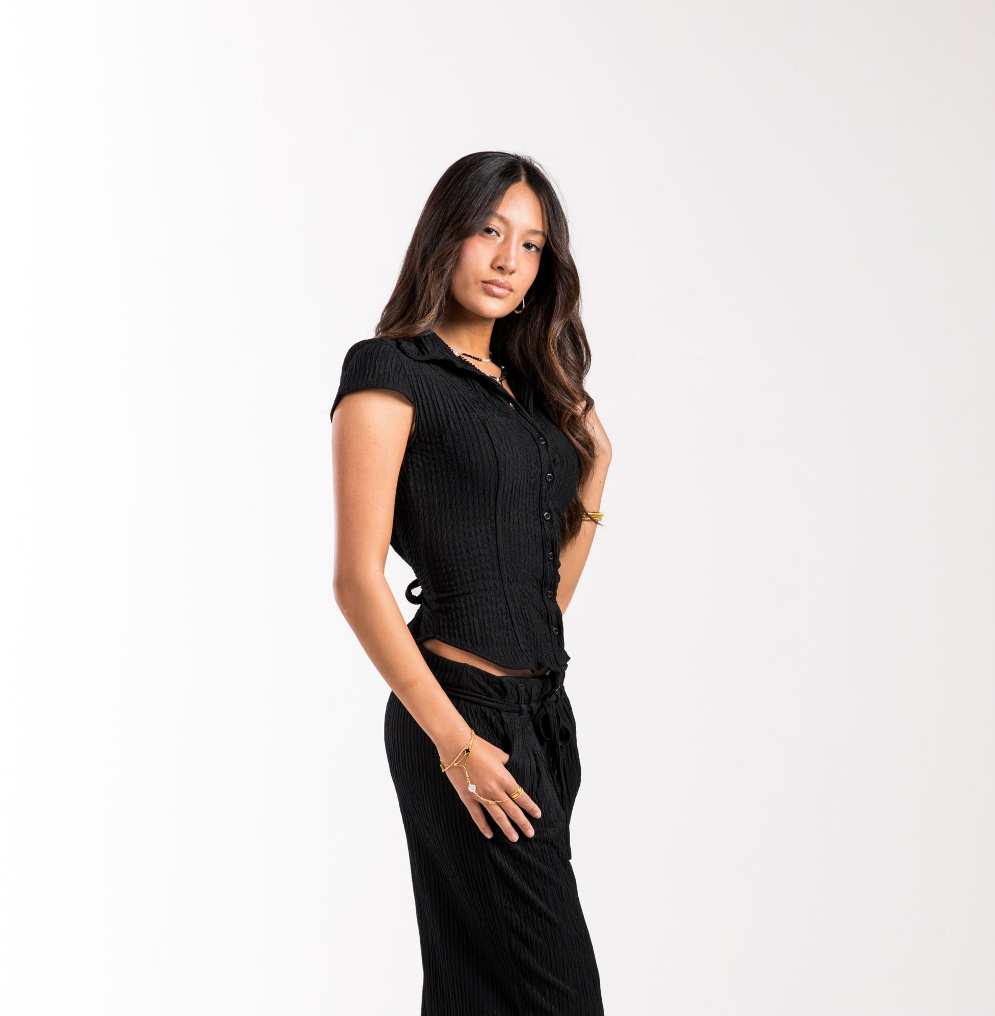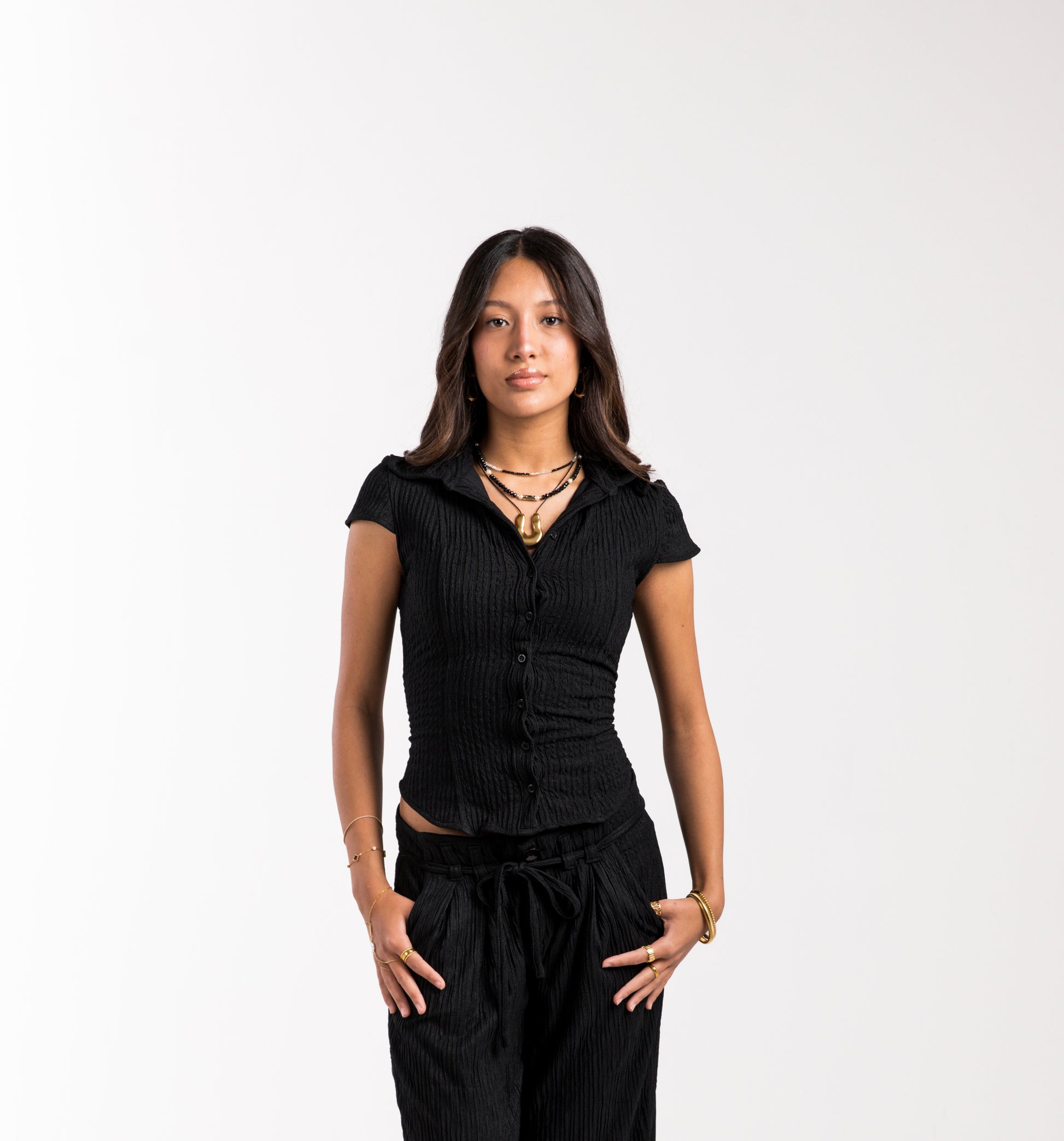 Introducing the Black Crinkled Belle Fit Shirt, a feminine and chic button-up shirt with quarter sleeves. Made with crinkled crepe fabric and featuring an adjustable ribbon bow in the back, this shirt is both stylish and comfortable. Perfect for any fashion-forward woman, it's a must-have addition to your wardrobe.