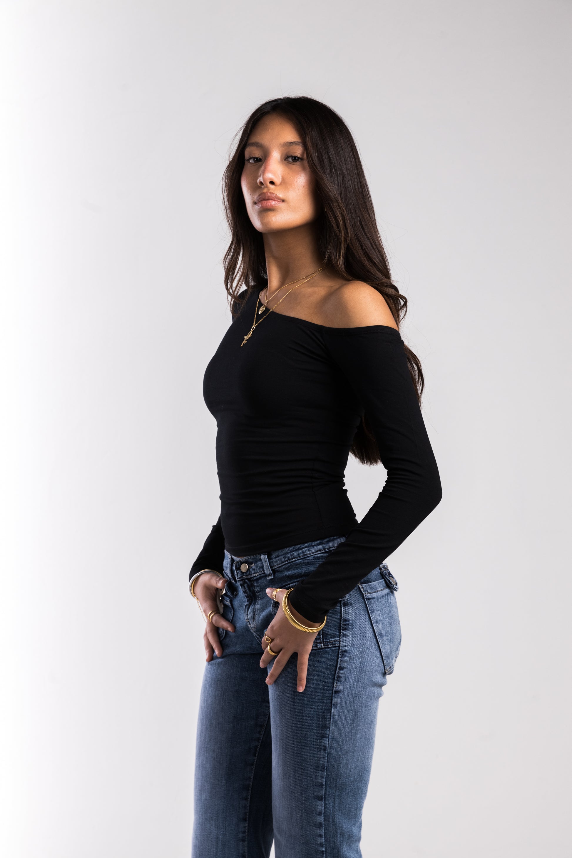 Discover effortless chic with our Black Sway Top. Made with a 5% lycra and 95% cotton blend, this long-sleeve top is both stretchy and stylish. The off-the-shoulder design adds a touch of elegance to any outfit. Perfect for any occasion.