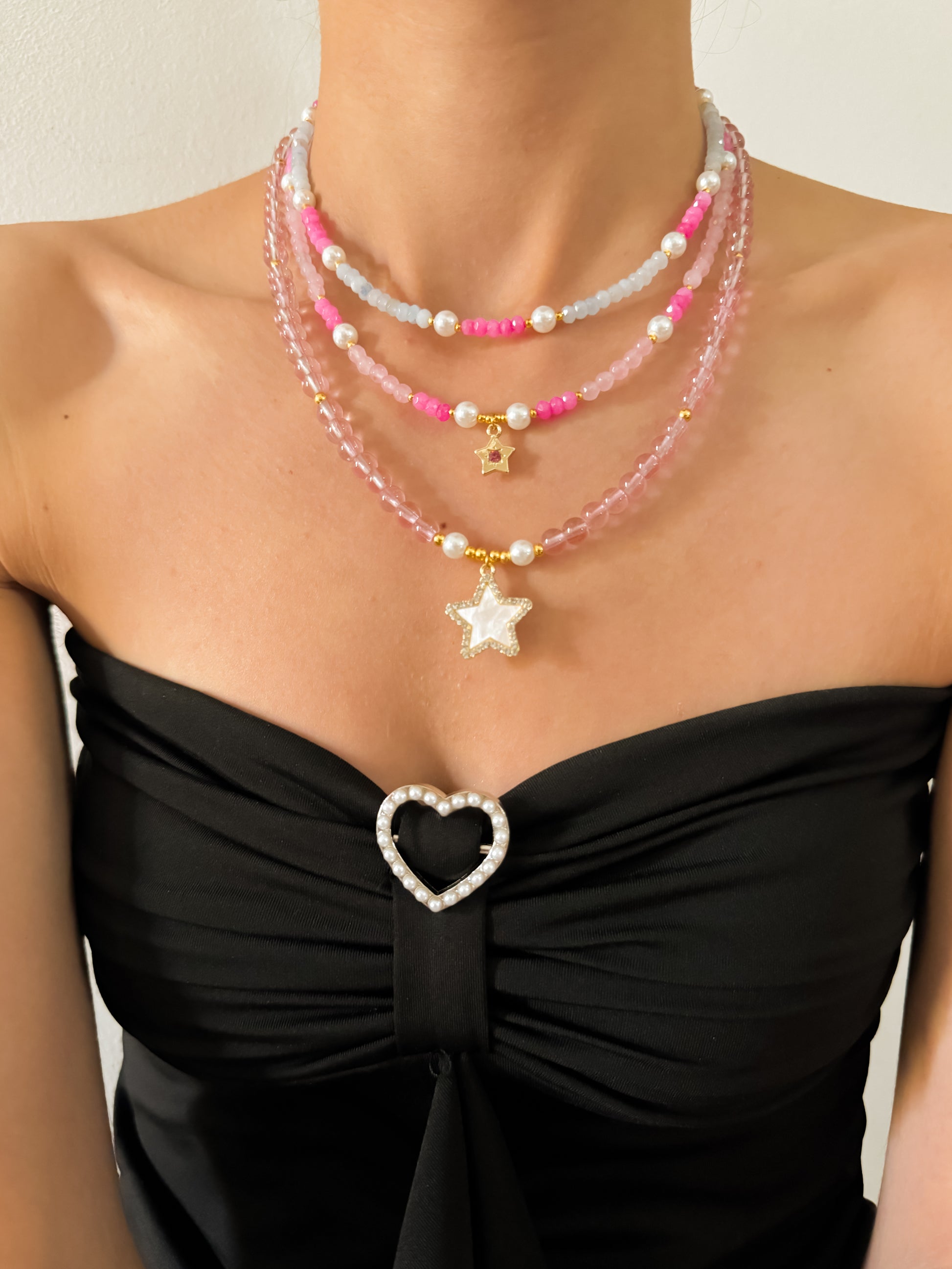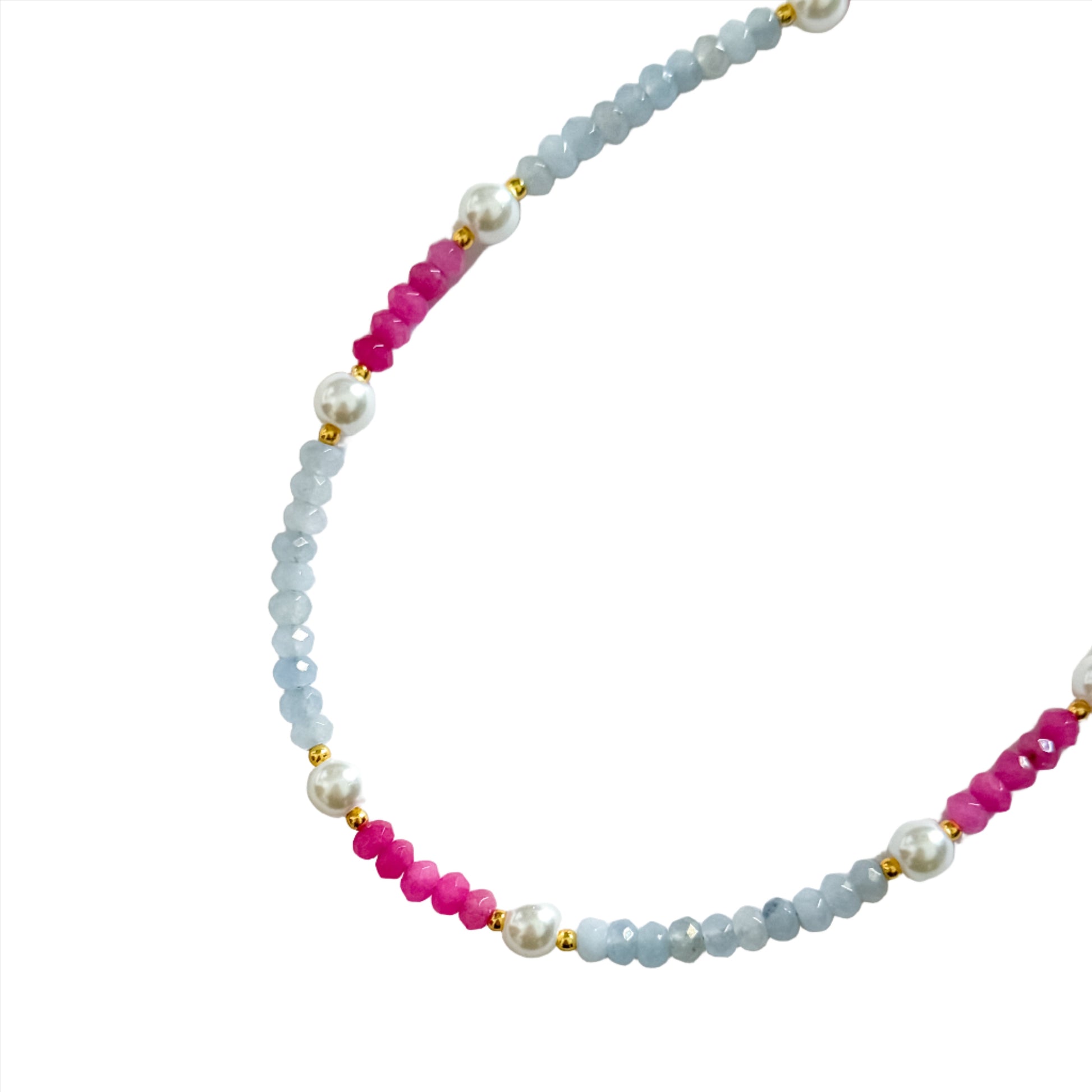 This handcrafted Agate blue and pink beaded choker is accented with gold and pearl details. It measures 35cm with a 5cm extension, providing a comfortable fit.