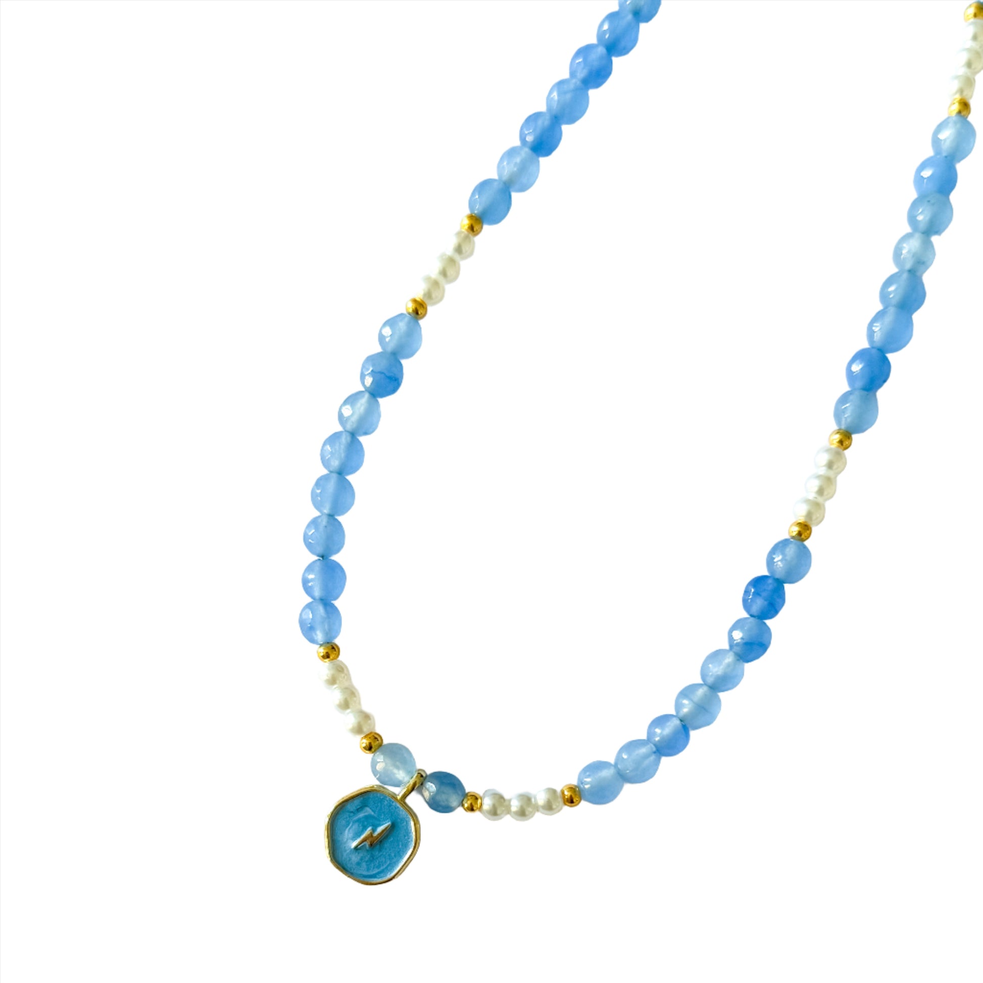 This blue agate beaded choker with 18k gold plated thunderbolt pendant is finished with delicate pearl details and 40cm length with a 5cm extension for versatile wear.