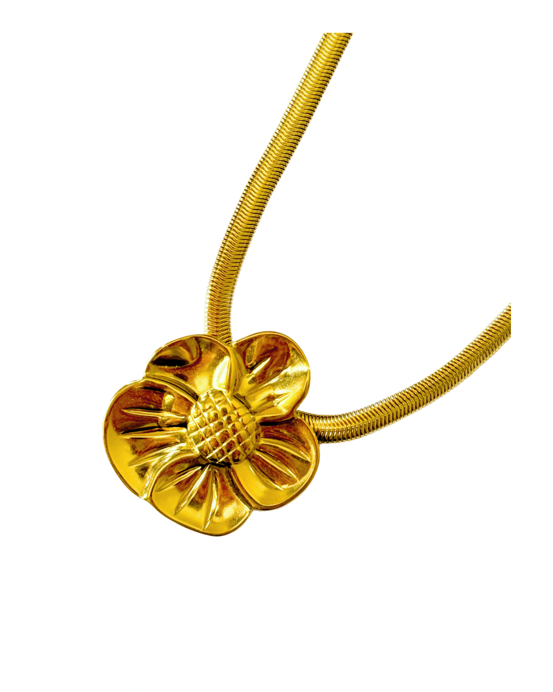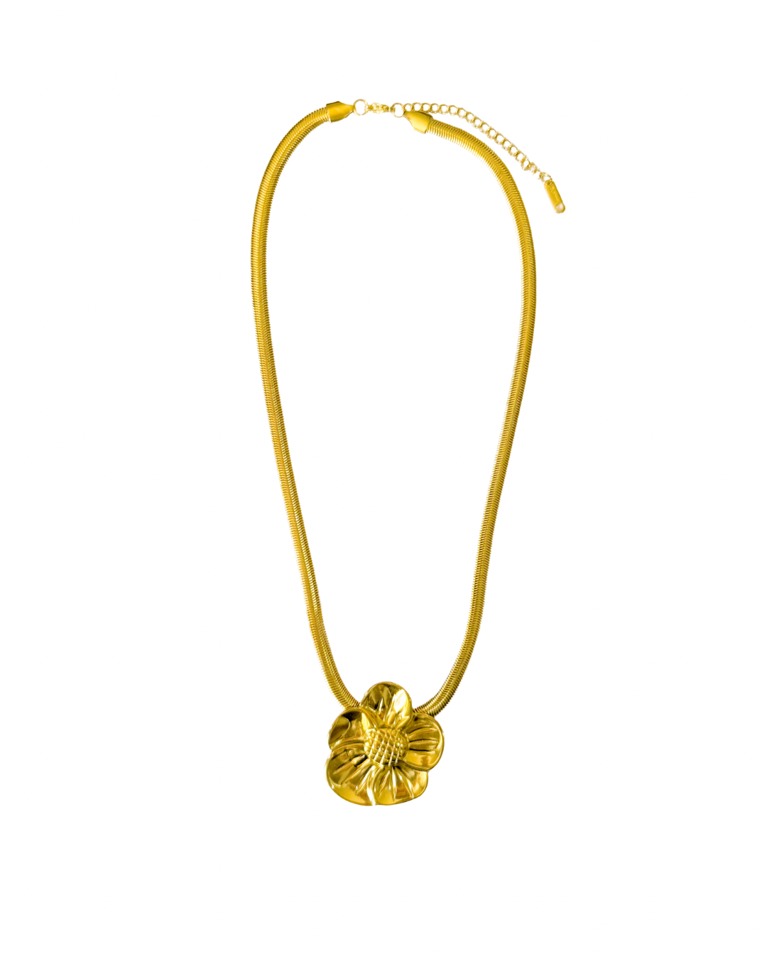 This stainless steel necklace features a chunky flower pendant, adding a touch of elegance to any outfit. The necklace measures 40cm with a 5cm extension, providing a comfortable and adjustable fit.