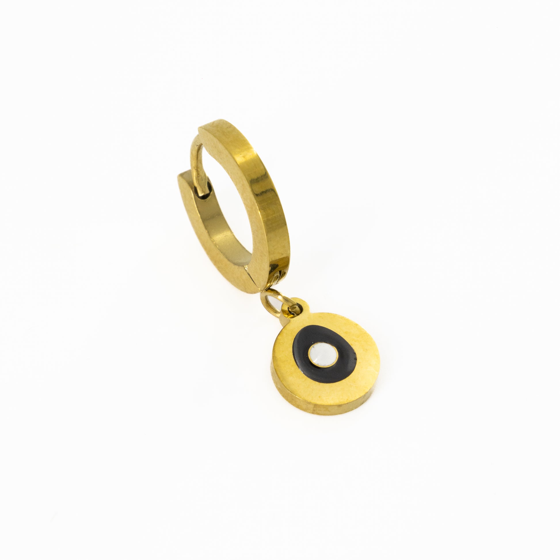 Expertly crafted from durable stainless steel, this Evil Eye Earring will add a touch of mystique to any outfit. Sold individually, not per pair, the earring features a striking black and gold evil eye design. Perfect for those who appreciate unique and eye-catching jewelry.