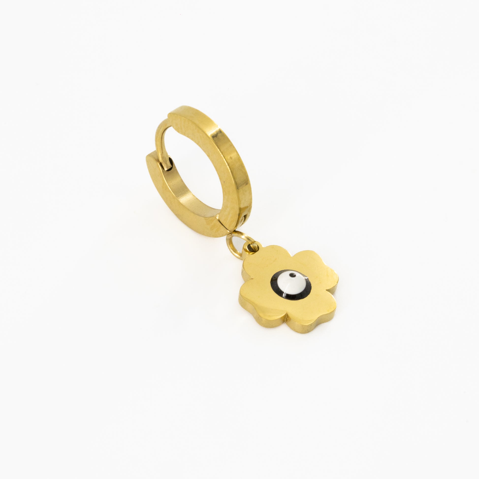 With a unique design featuring a black evil eye and a gold flower, these stainless steel earrings are sure to make a statement. Sold individually, not per pair, they offer a modern twist to any ensemble. Elevate your style and ward off negativity with these eye-catching earrings.