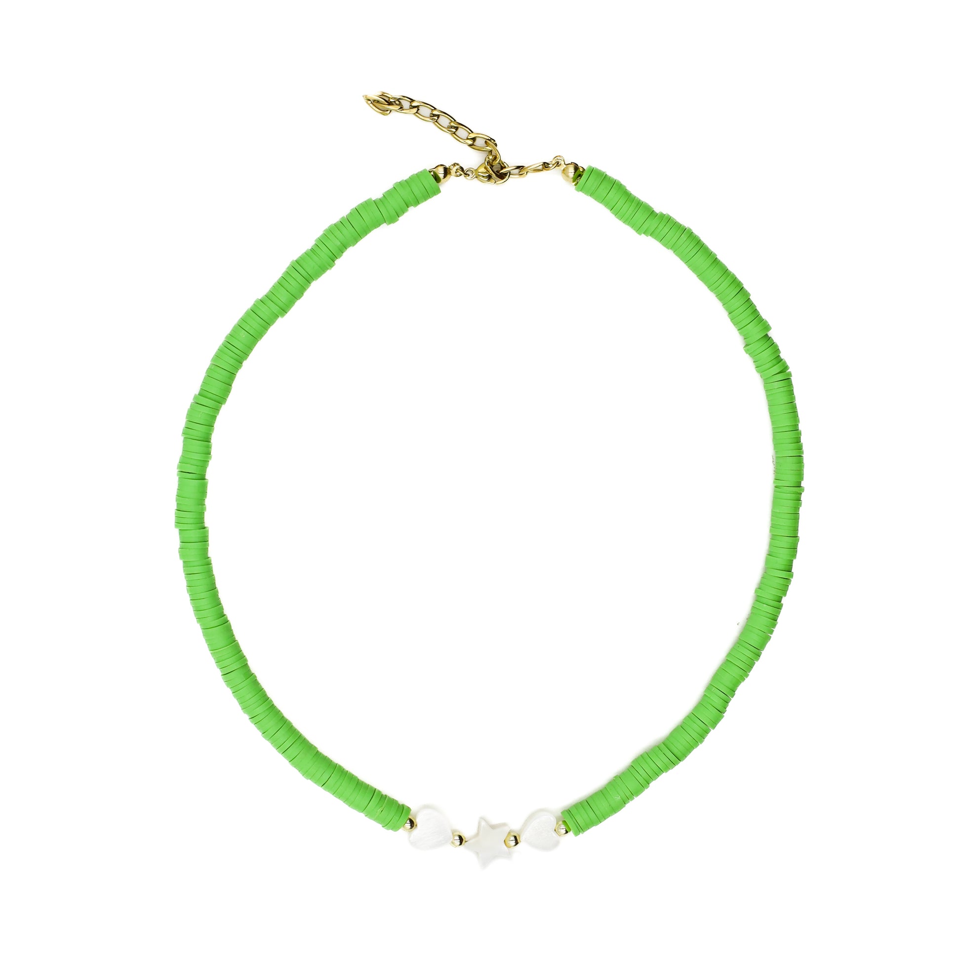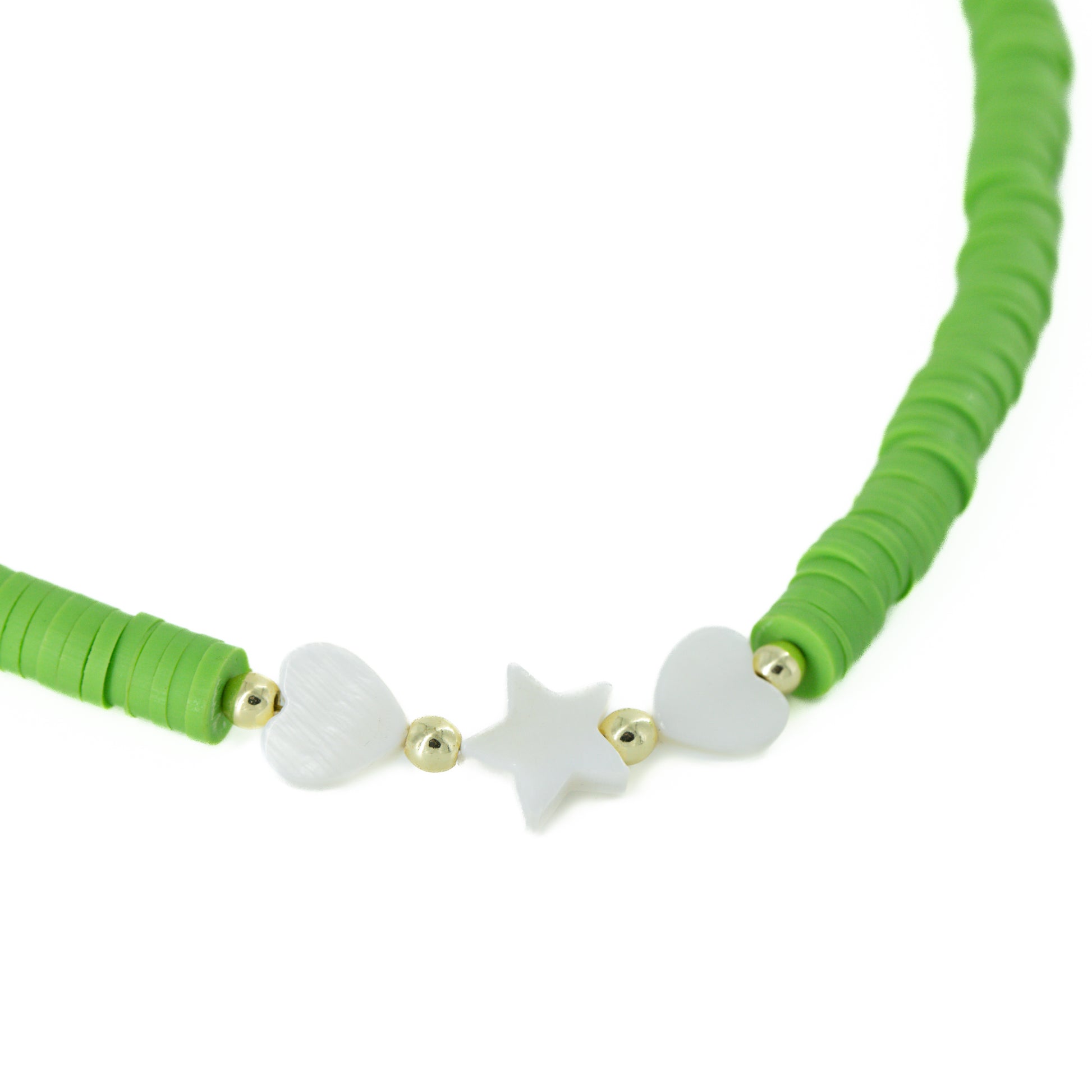 The Green Beaded Choker with Hearts is expertly crafted from green clay beads and adorned with charming heart and star charms. The 18k gold plated details add a touch of elegance, while the 40cm length with 5cm extension ensures a perfect fit.