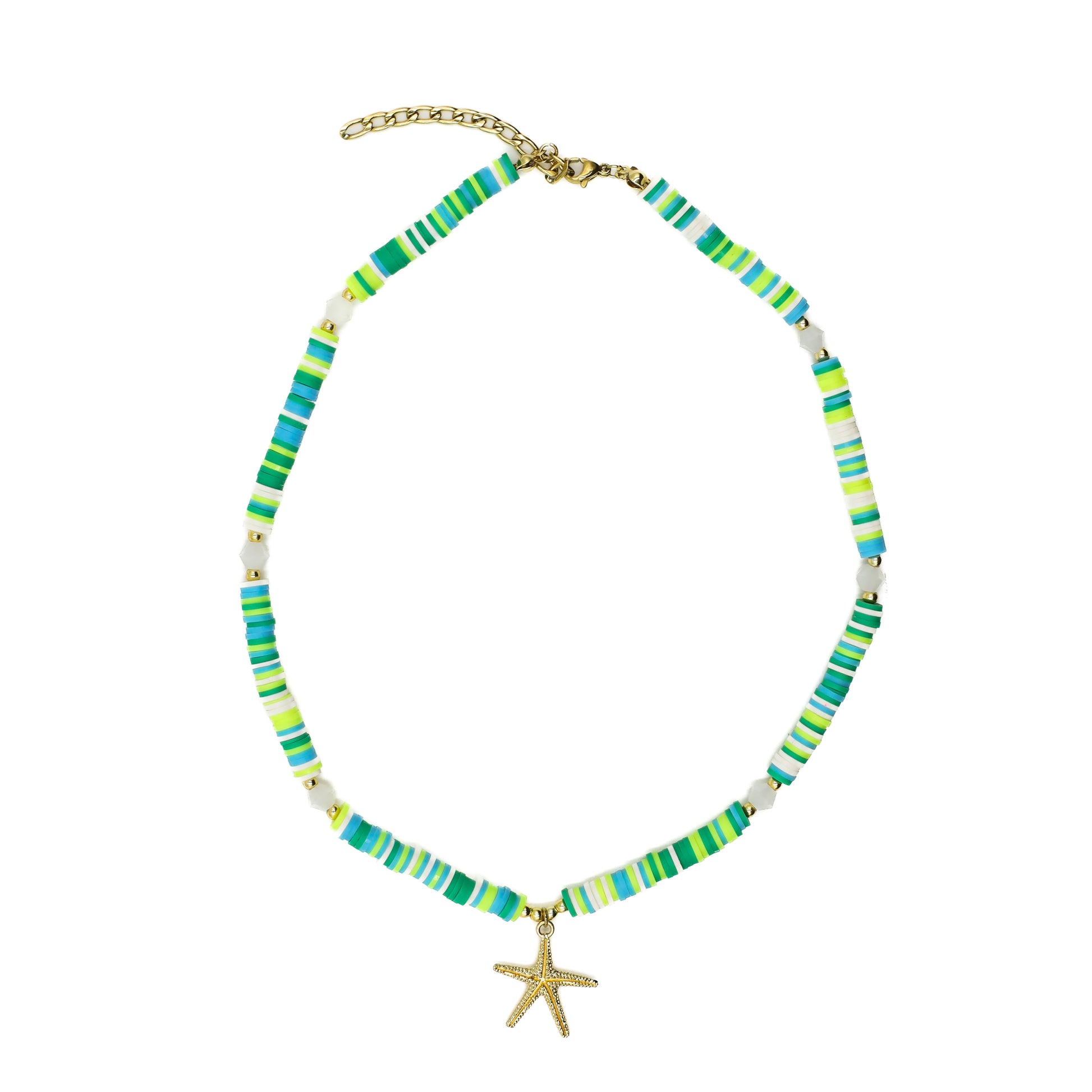Experience the beauty of the ocean with our colorful starfish beaded choker. Crafted with multicolored clay beads and an 18k gold plated starfish pendant, this 40cm choker comes with a 5cm extension for a perfect fit. Add a touch of playful elegance to any outfit.