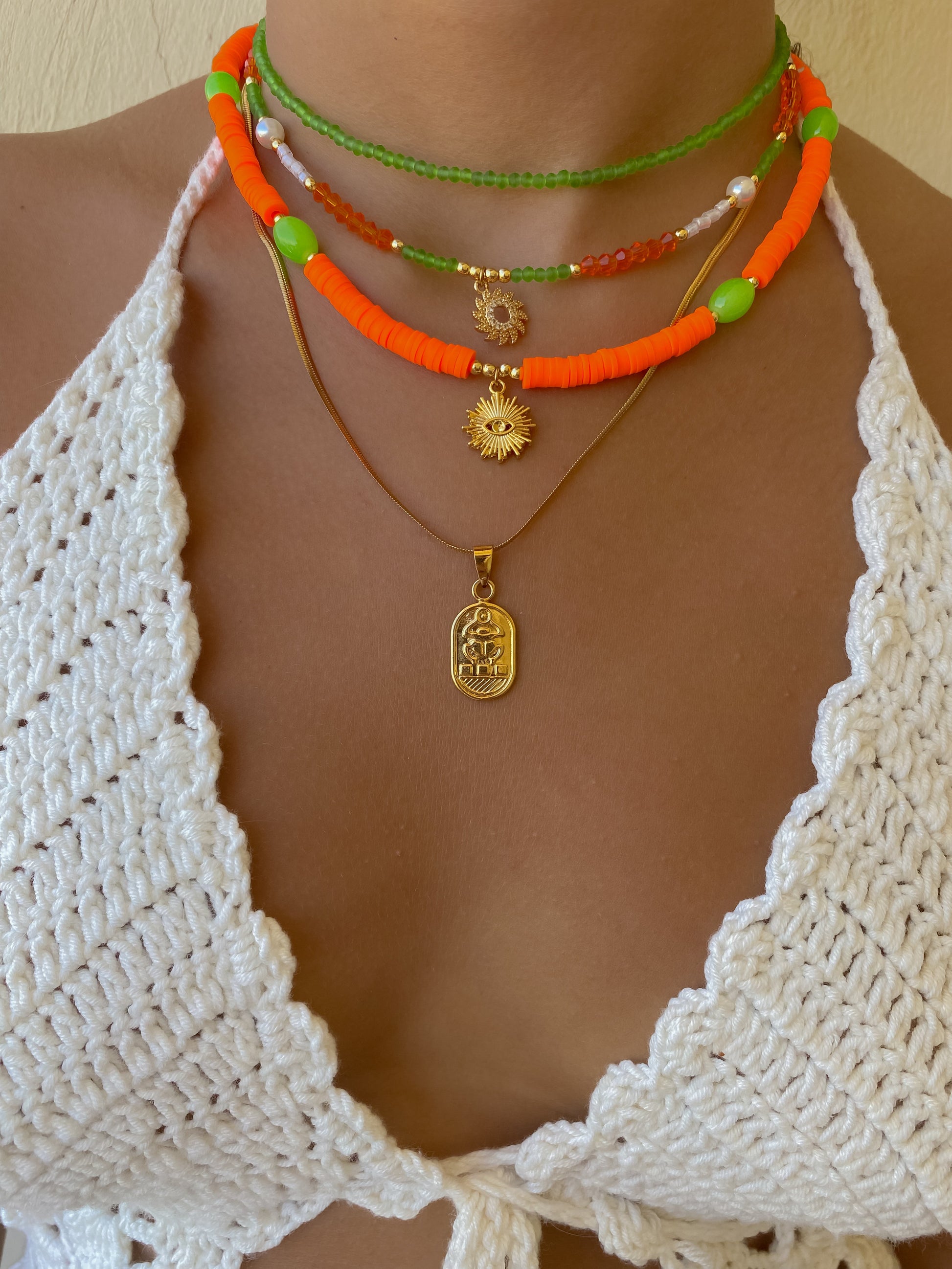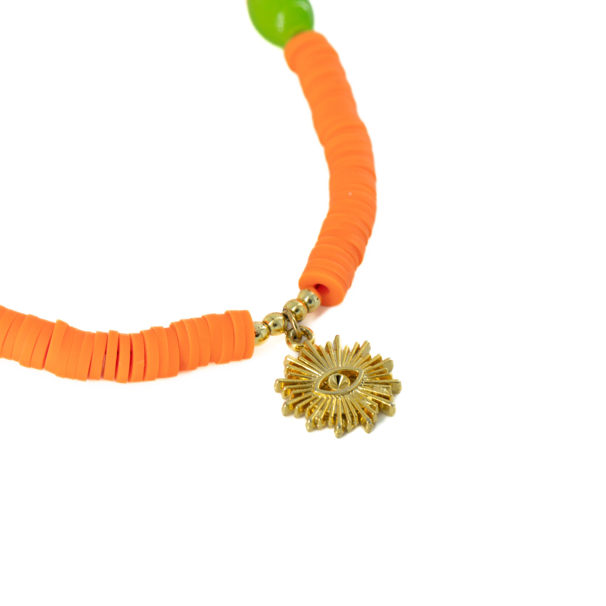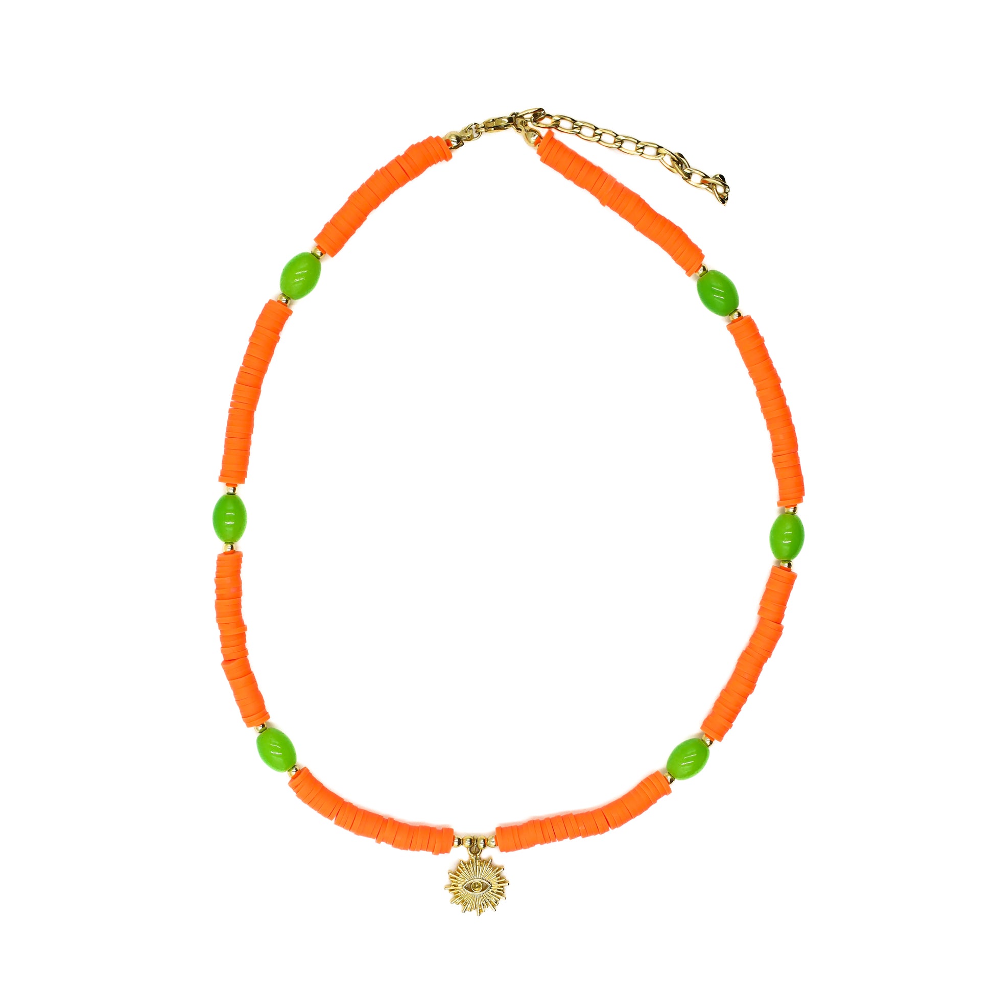 Enhance your style with our Orange Beaded Evil Eye Choker. Made of high-quality orange clay beads, it features an 18k gold plated evil eye pendant. This choker measures 40cm with a 5cm extension, allowing you to adjust it to your desired fit. Protect yourself from negative energies in style.