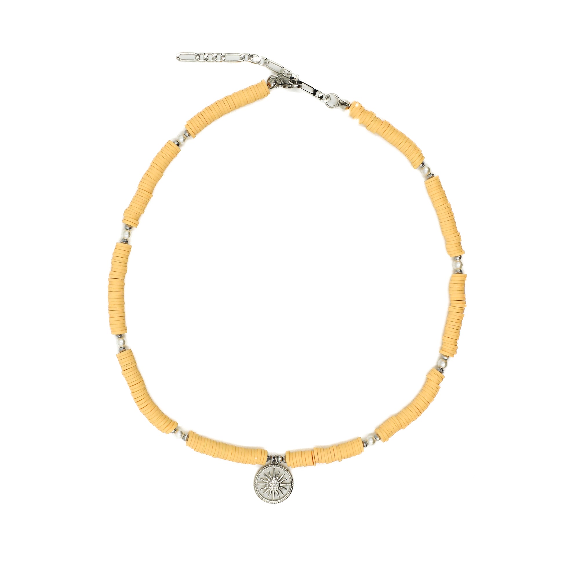 Elevate your summer look with our Peach Beaded Sun Choker. Crafted with peach clay beads and an 18k white gold plated sun pendant, this choker adds a touch of warm elegance to any outfit. With a 40cm length and 5cm extension, it's the perfect fit for any neck.