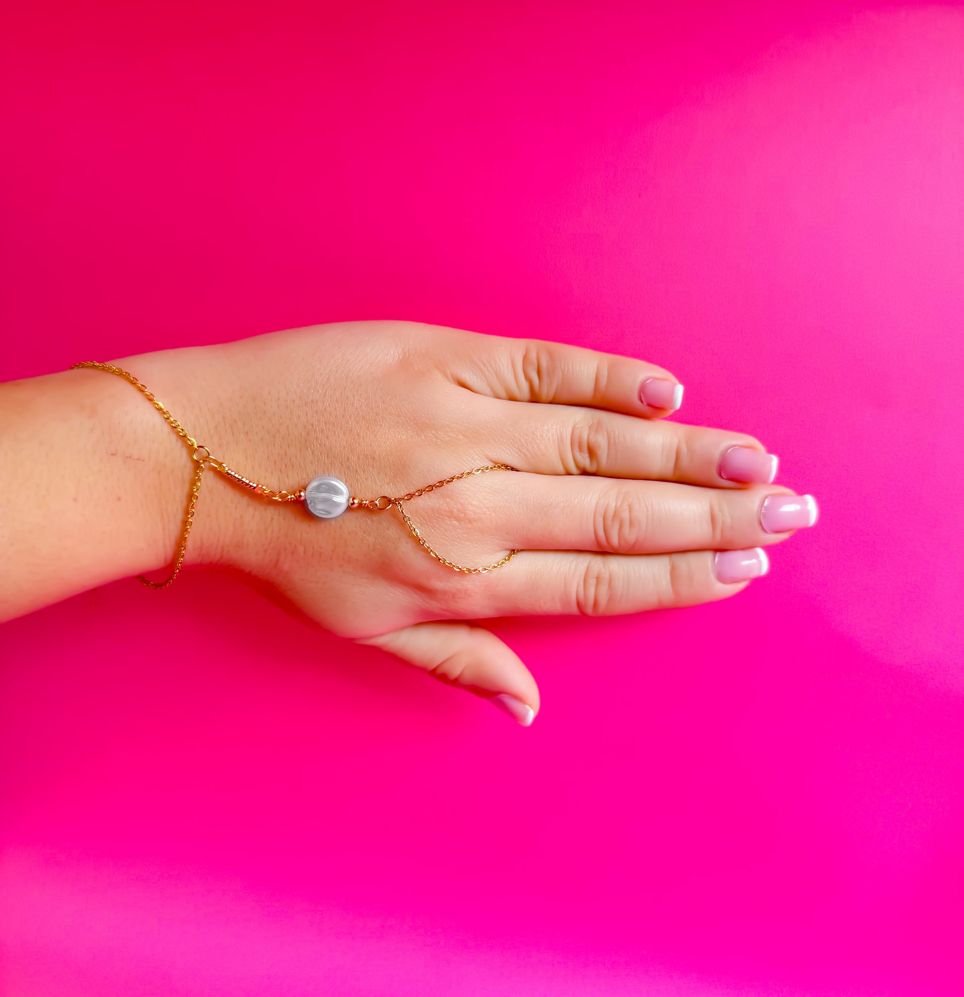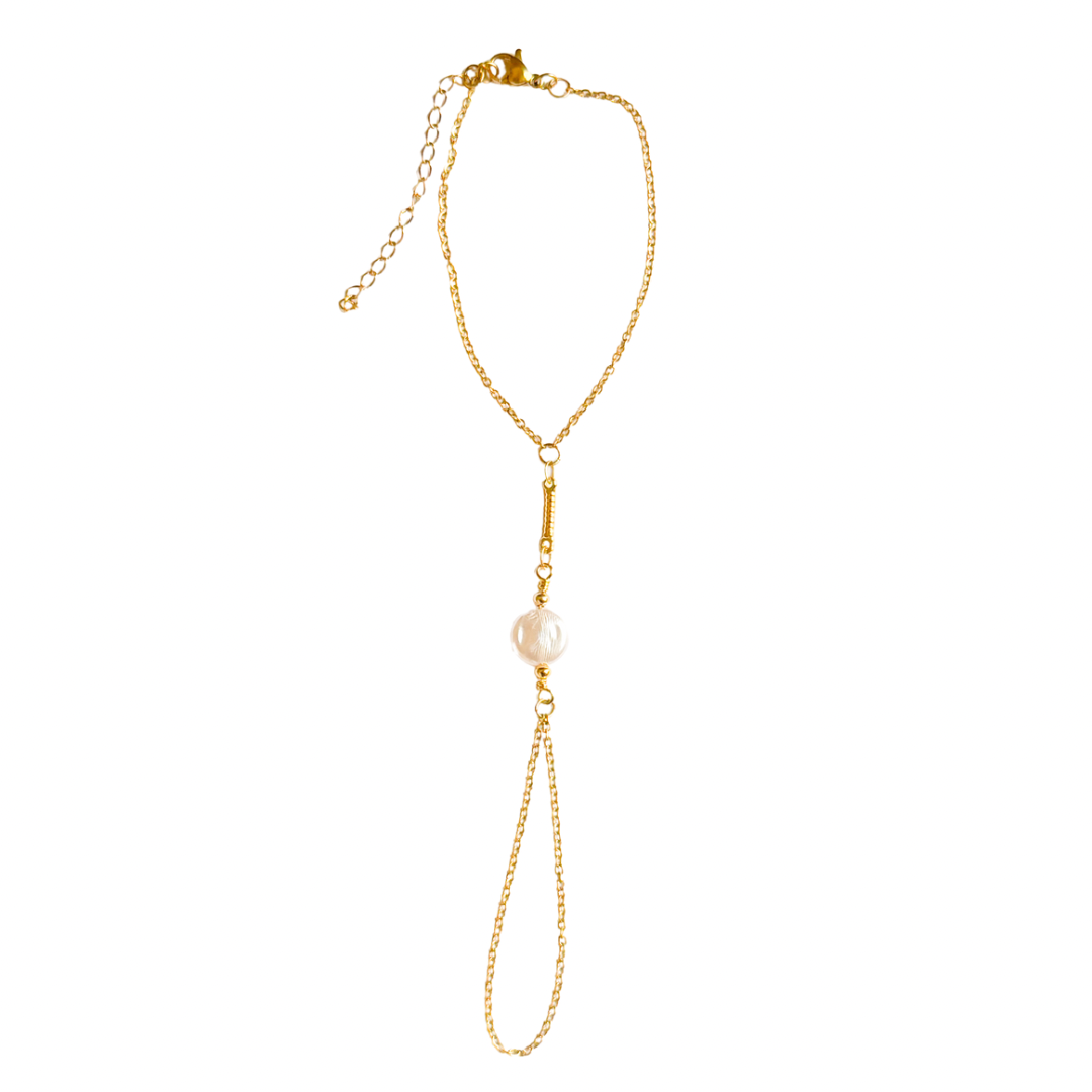 This stylish handchain features a stainless steel bracelet ring with an adjustable fit. The pearl and gold beads add a touch of elegance. Expertly crafted and perfect for any occasion.