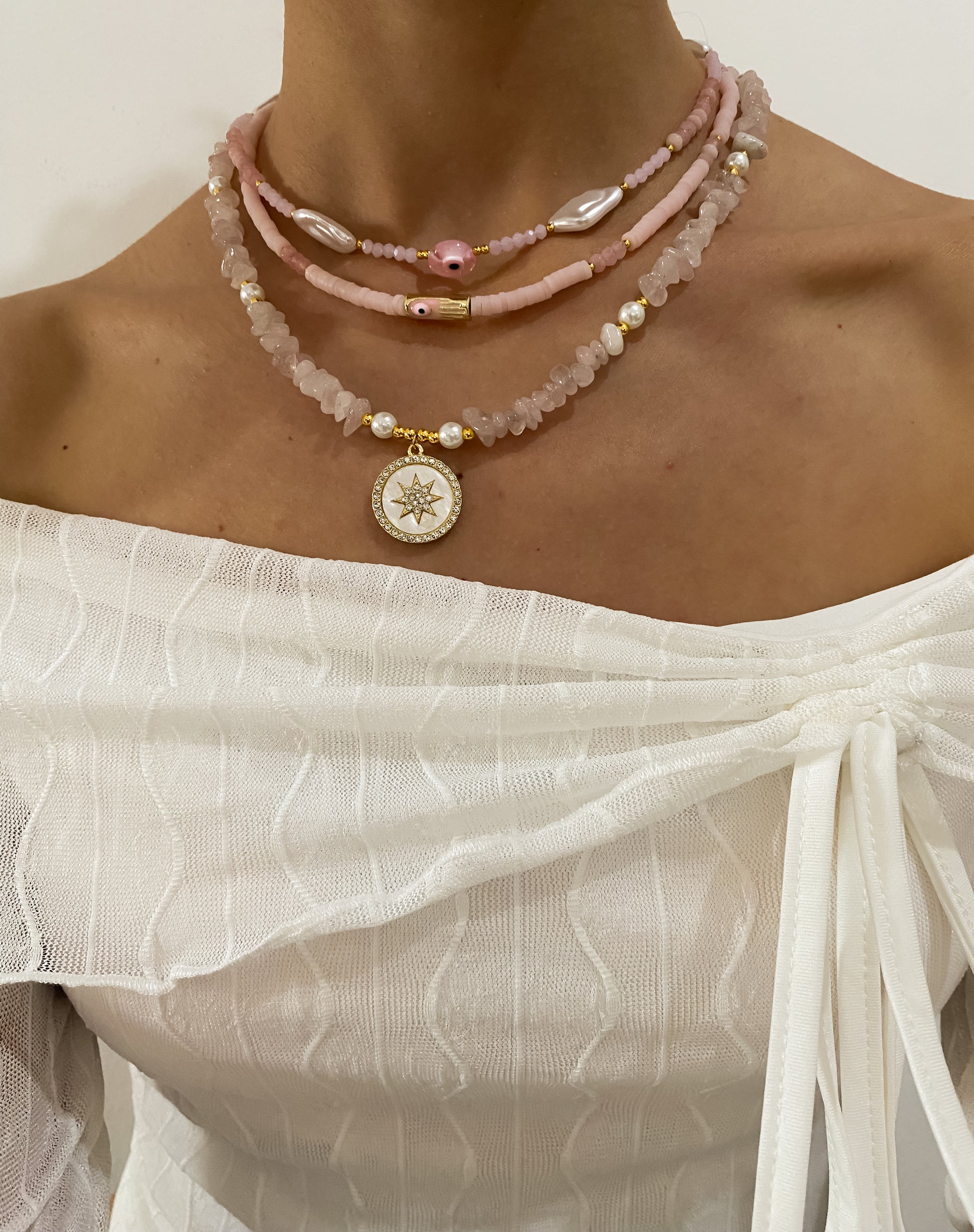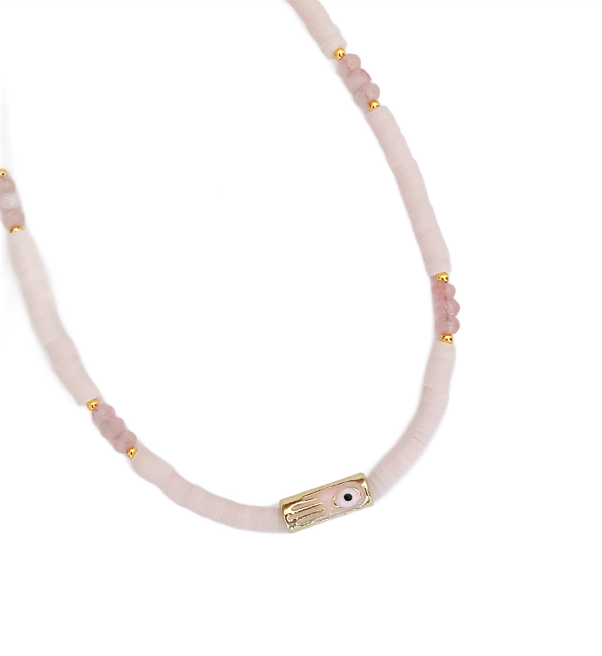 This Pink Beaded Evil Eye Choker adds a touch of elegance and protection with its 18k gold plated hamsa evil eye pendant. The pink beads provide a pop of color and the adjustable length allows for a perfect fit. Stay stylish and safe with this must-have accessory.