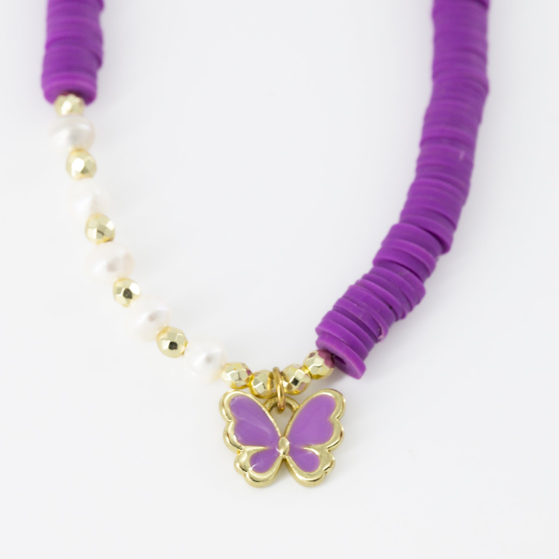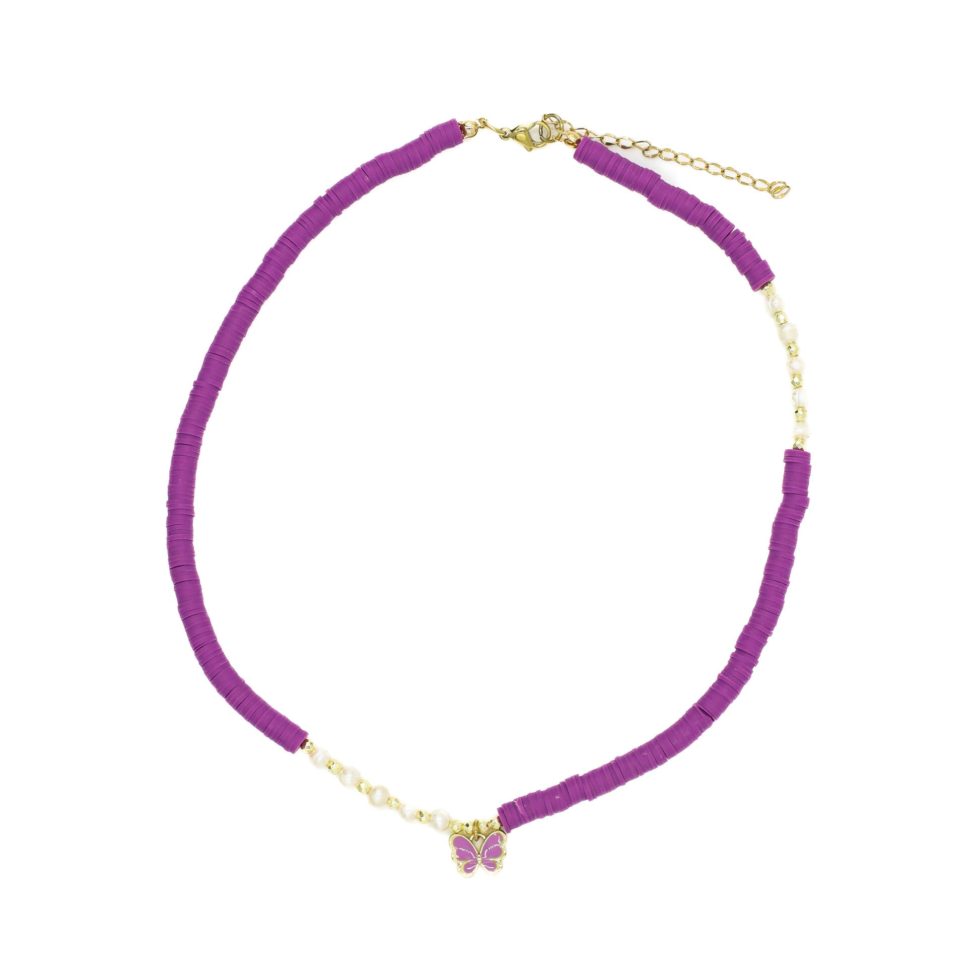 Elevate your style with our Purple Beaded Butterfly Choker. Handcrafted with purple clay beads, this choker features a stunning 18k gold plated butterfly pendant. Measuring 40cm with a 5cm extension, it's the perfect length for any neckline.
