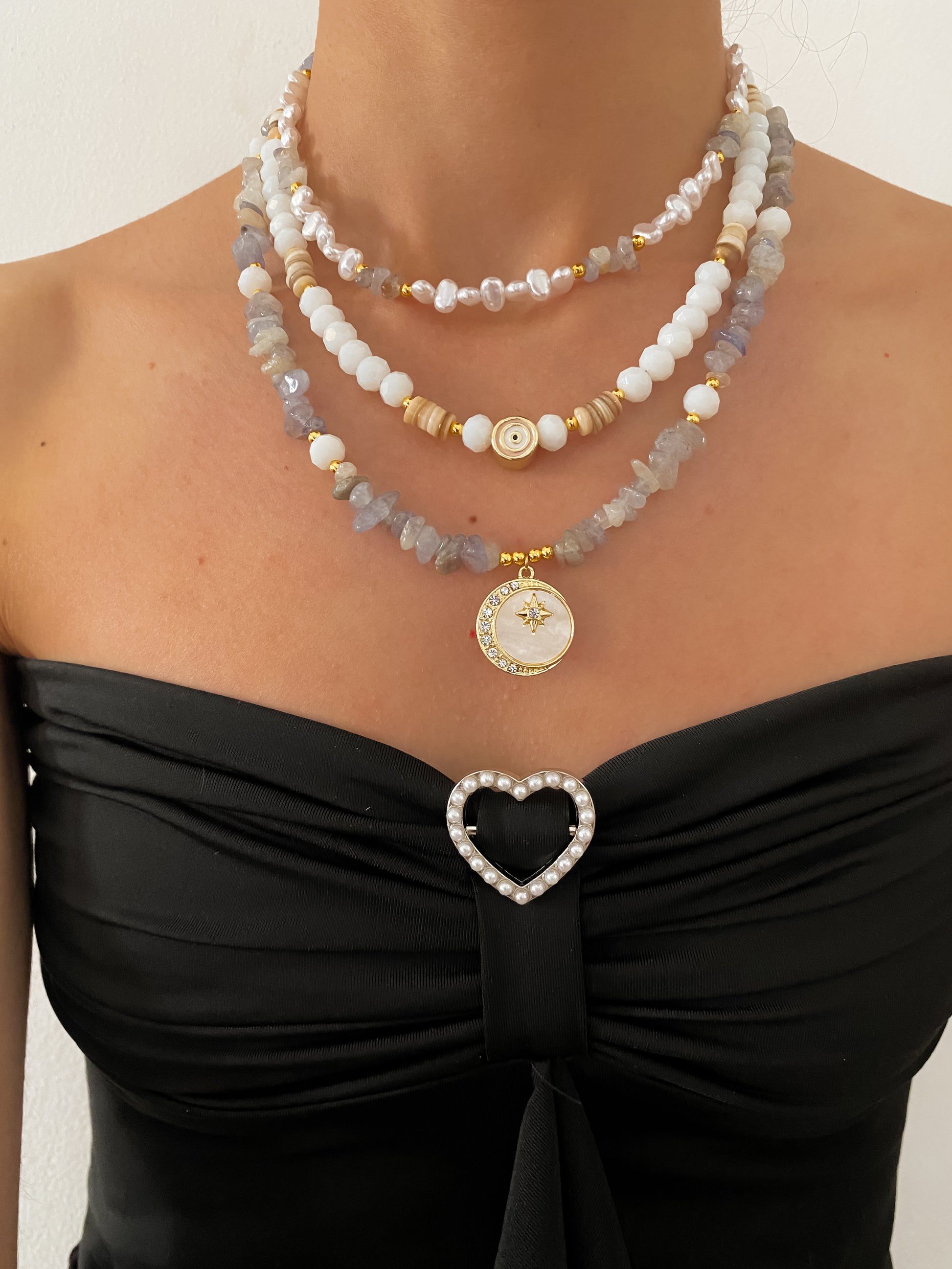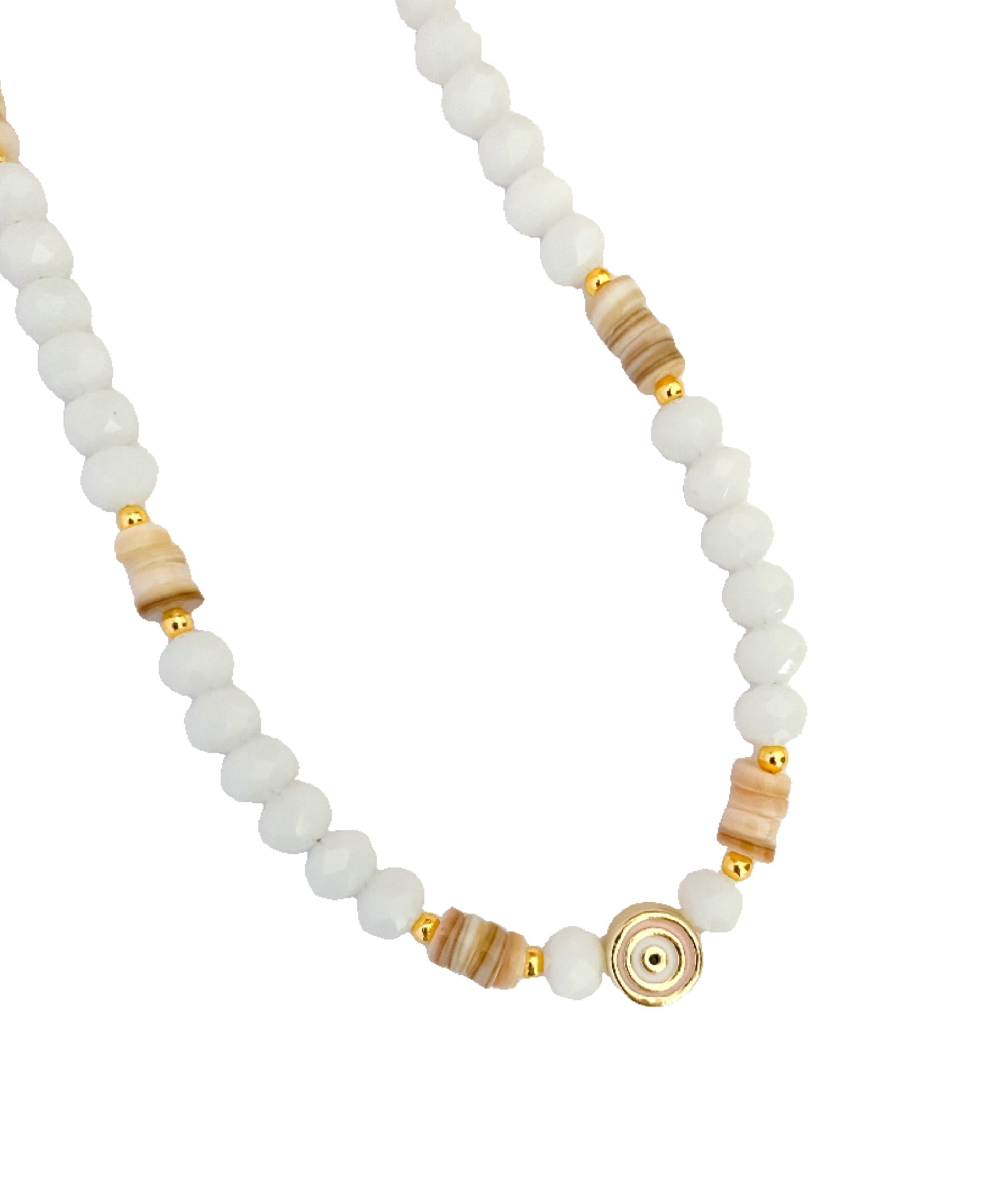 This 18k gold plated pink evil eye charm effortlessly complements the white beaded choker. The charm measures 35cm with a 5cm extension, making it a versatile and stylish accessory for any outfit. Protect yourself from bad energy while staying on trend with this elegant choker.